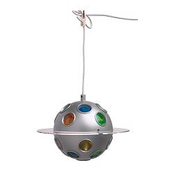 It doesn’t shed light like a normal lamp, but instead is this sort of ugly gray orb with spots on it. When it’s not working its magic, it’s hard not to wonder why you bought it. But when it’s hung up and on, it casts crescent moons, stars, and a Saturn-looking planet everywhere. And if it is moving, these things spin all over the room, in a swirl of pastel colors. (Provided that you lower the lights first; it is useless for providing normal illumination.)