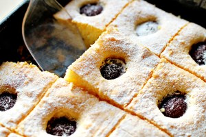 Each of nine children was wholly disgusted. Some, perhaps, by the one glossy purple eye gazing up at them. Others may have balked at the fact that it was two things combined, which children often do not approve of. And I admit that the joy of the cake — the sponge — is that the juicy plums are sourish against the sweet of the yellow sponge cake, and this contrast appeals greatly to my adult palate.